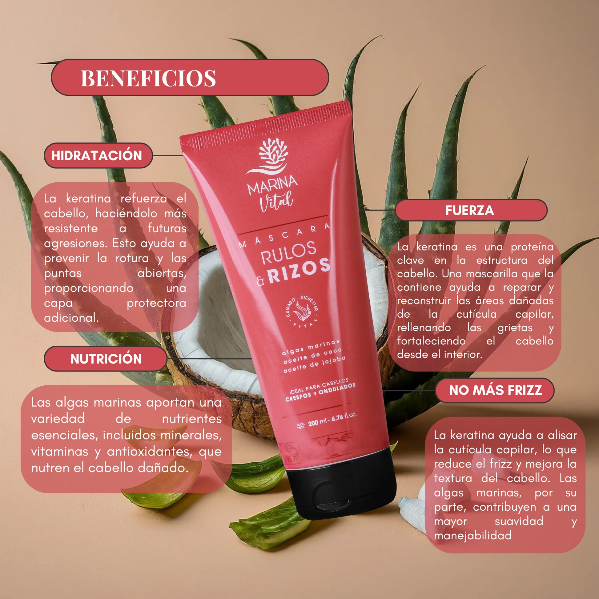 Máscara capilar a base de Algas Marinas, Aceite de Coco y Aceite de Jojoba, que entrega protección y definición a los cabellos rizados. Sus activos penetran la fibra capilar, proporcionando una hidratación profunda, entregando flexibilidad al rizo y ayudando a controlar el frizz natural de los cabellos ondulados.